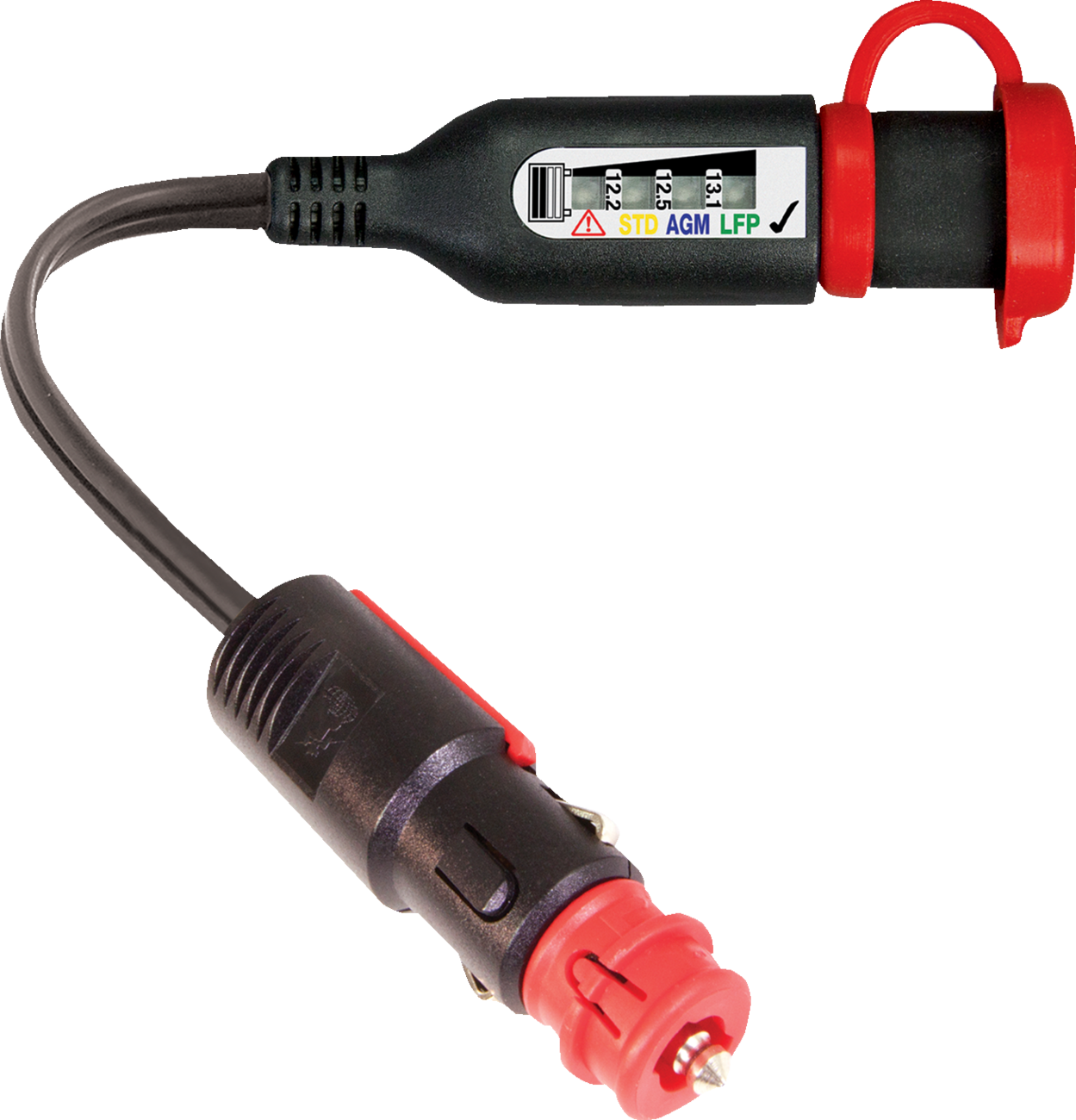 SAE to DIN/AUTO 12 V socket adapter with state of charge monitor that plugs directly into your motorcycle, or ATV/UTV, 12 V power port - adapter with 24/7 battery status at a blink of an LED