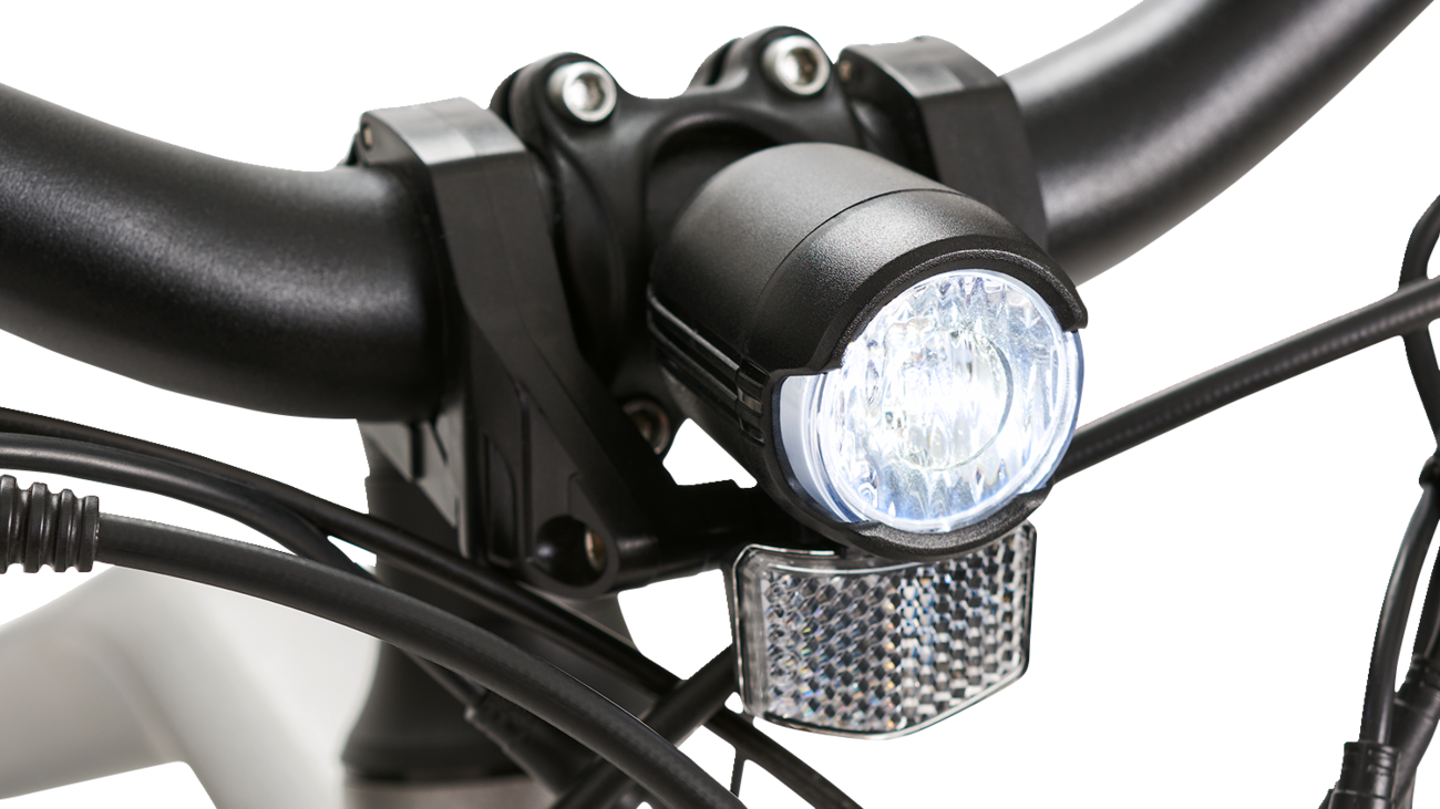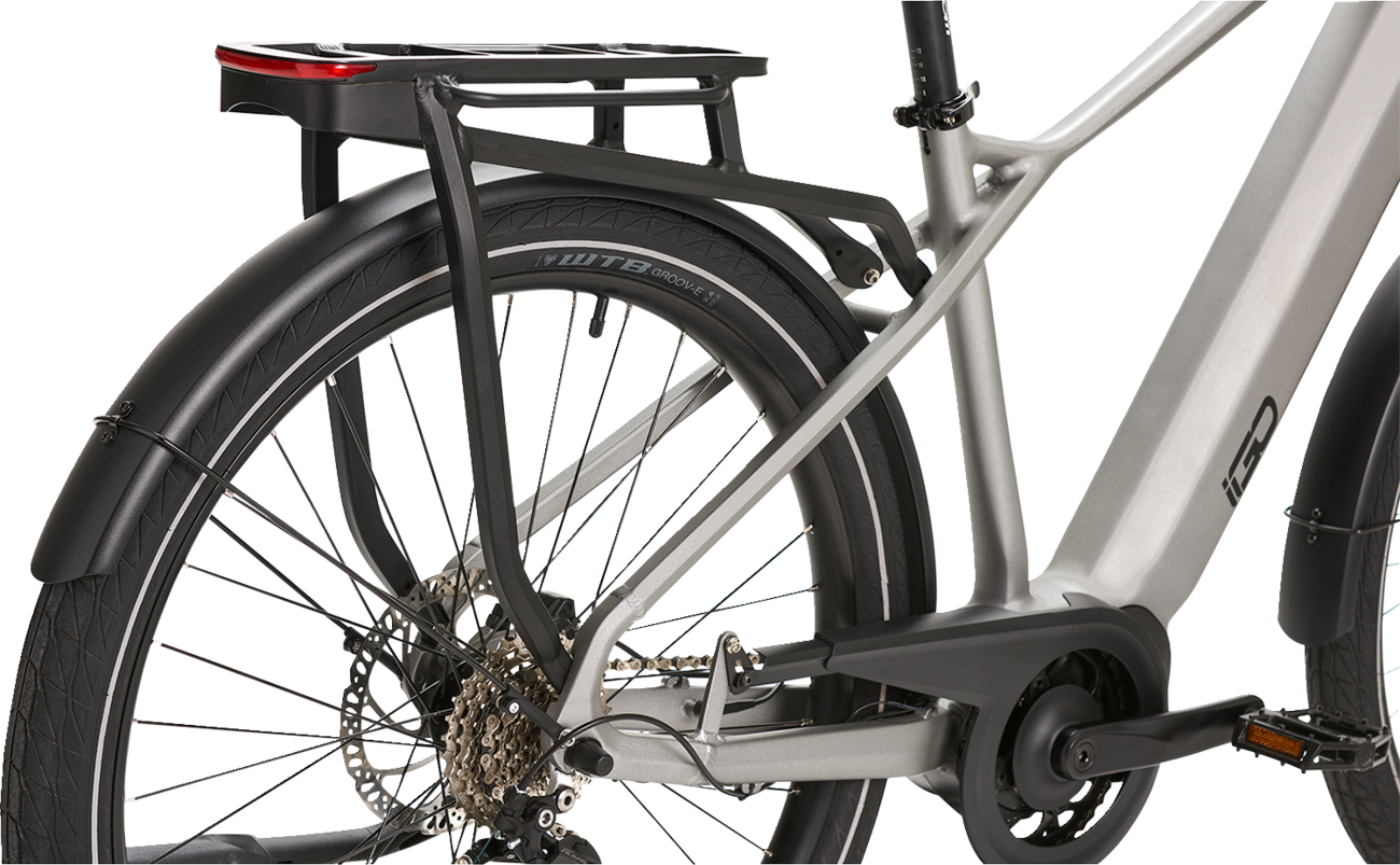 Front LED light XC-259A (powered by main battery), Rear LED SPANNINGA LED Commuter Glow XE with brake light Integrated into rear rack (powered by main battery), Front & Rear Fenders, Rear Cargo Rack Accessory ready, Integrated Chainring Guard, Water Bottle Bosses on Seat Tube, Kickstand, Wellgo Pedals, Bell, Tool Kit, Battery Charger
