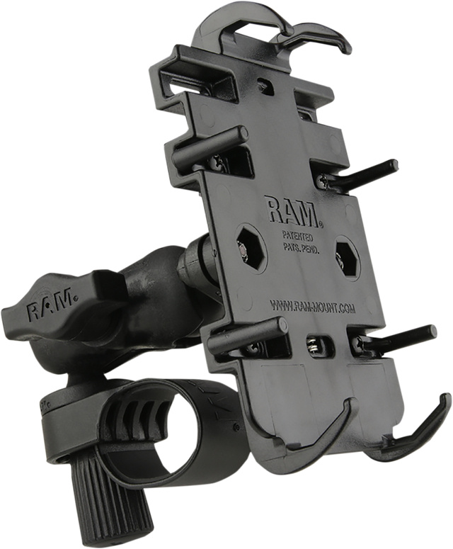 Low-profile handlebar mount for phones includes the RAM® Tough-Strap™, easily attaching to your handlebar with the turn of a single knob