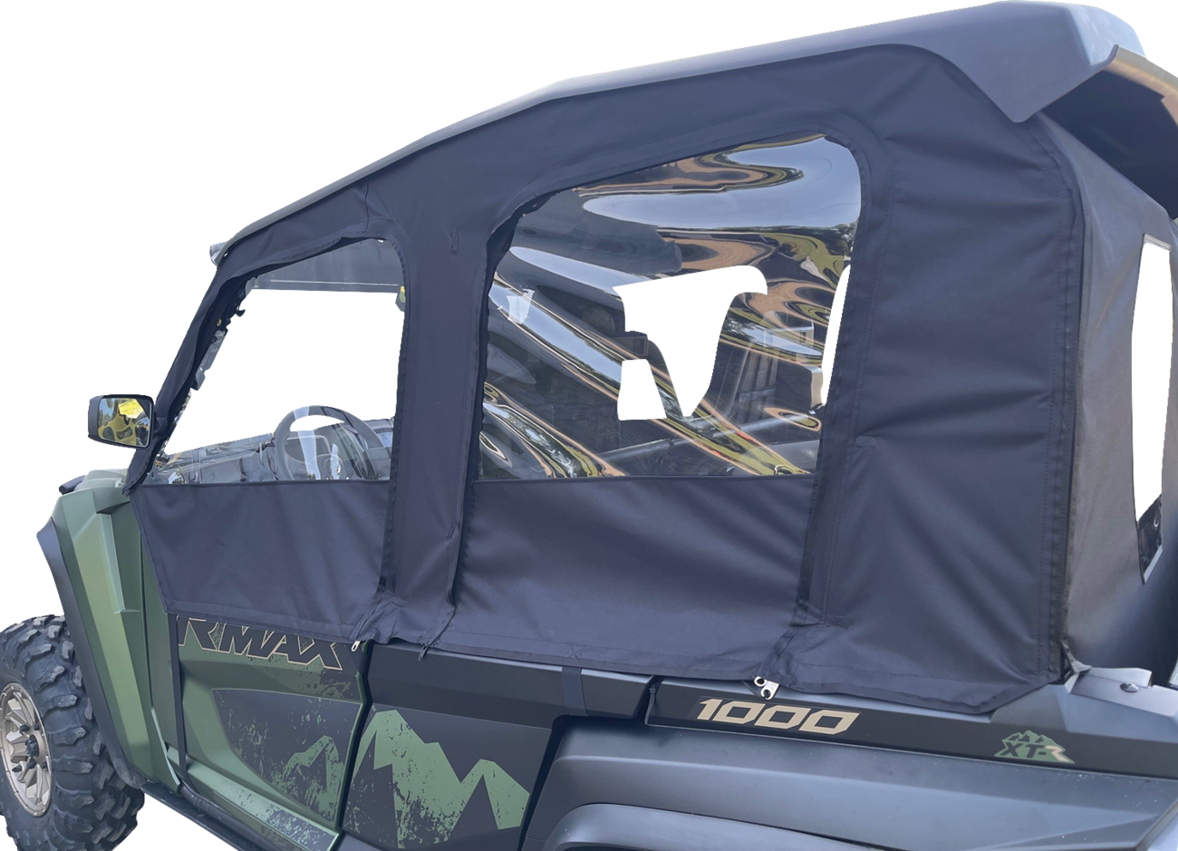 Automotive grade clear flexible acrylic side windshield sewn in upper section of doors