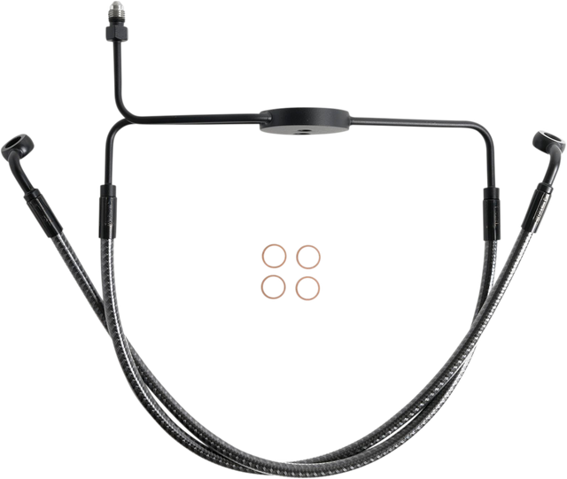 Brake line kit consists of a direct fit lower assembly used in conjunction with alternative length upper lines