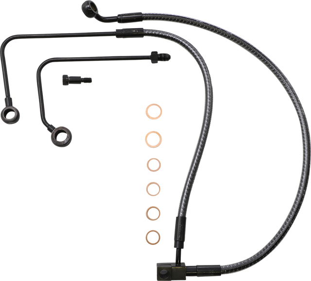 Brake line kit consists of a direct fit lower assembly used in conjunction with alternative length upper lines