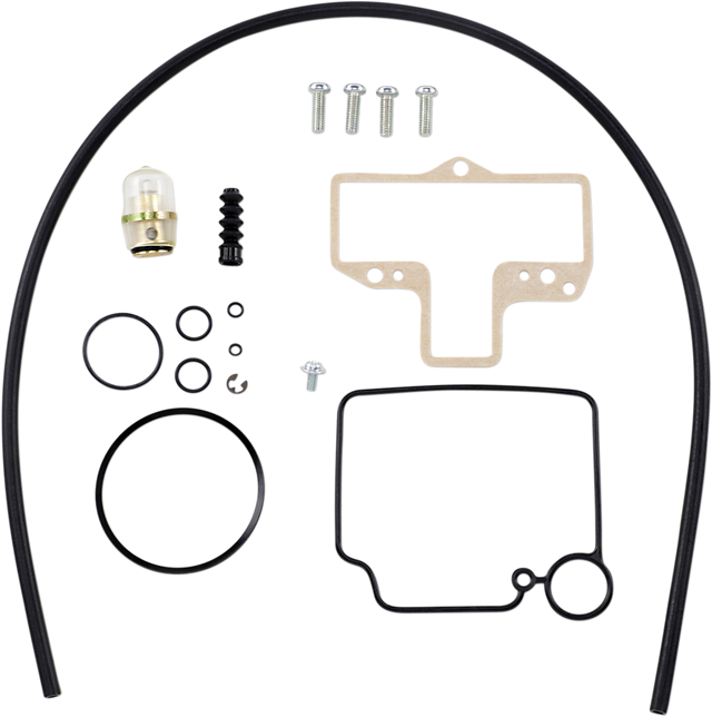 Includes top cover gasket, jet needle (with E-ring and washer), throttle valve seal, pilot air O-ring, fuel joint O-ring, accelerator pump O-ring, needle valve O-ring, needle valve retainer screw, needle valve assembly, float bowl O-ring/gasket, overflow hose, float bowl screws and accelerator pump rod boot