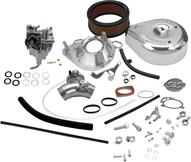 Carb kit includes a carburetor with updated fuel delivery pots and idle screws, teardrop air cleaner assembly, manifold, mounting hardware, fuel line, clamps, overflow line, one extra intermediate jet and two main jets, VOES tubing (when applicable), installation and jetting instructions