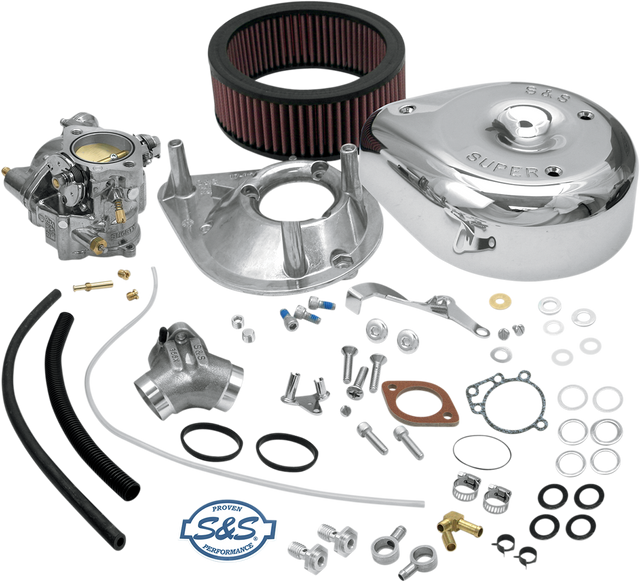 Carb kit includes a carburetor with updated fuel delivery pots and idle screws, teardrop air cleaner assembly, manifold, mounting hardware, fuel line, clamps, overflow line, one extra intermediate jet and two main jets, VOES tubing (when applicable), installation and jetting instructions