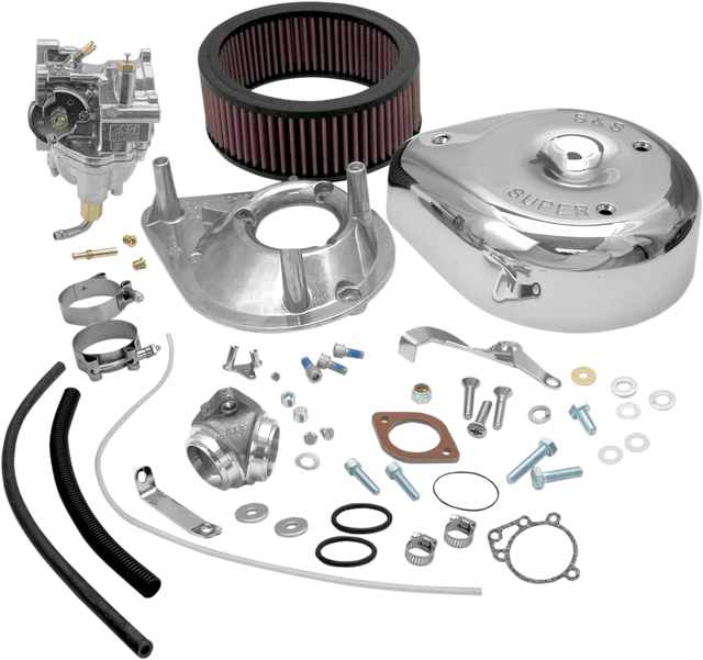 Carb kit includes a carburetor with updated fuel delivery pots and idle screws, S&S teardrop air cleaner assembly, manifold, mounting hardware, fuel line, clamps overflow line, one extra intermediate jet and two main jets, VOES tubing (when applicable), installation and jetting instructions