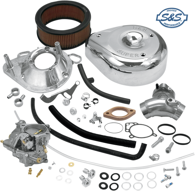 Carb kit includes a carburetor with updated fuel delivery pots and idle screws, S&S teardrop air cleaner assembly, manifold, mounting hardware, fuel line, clamps overflow line, one extra intermediate jet and two main jets, VOES tubing (when applicable), installation and jetting instructions