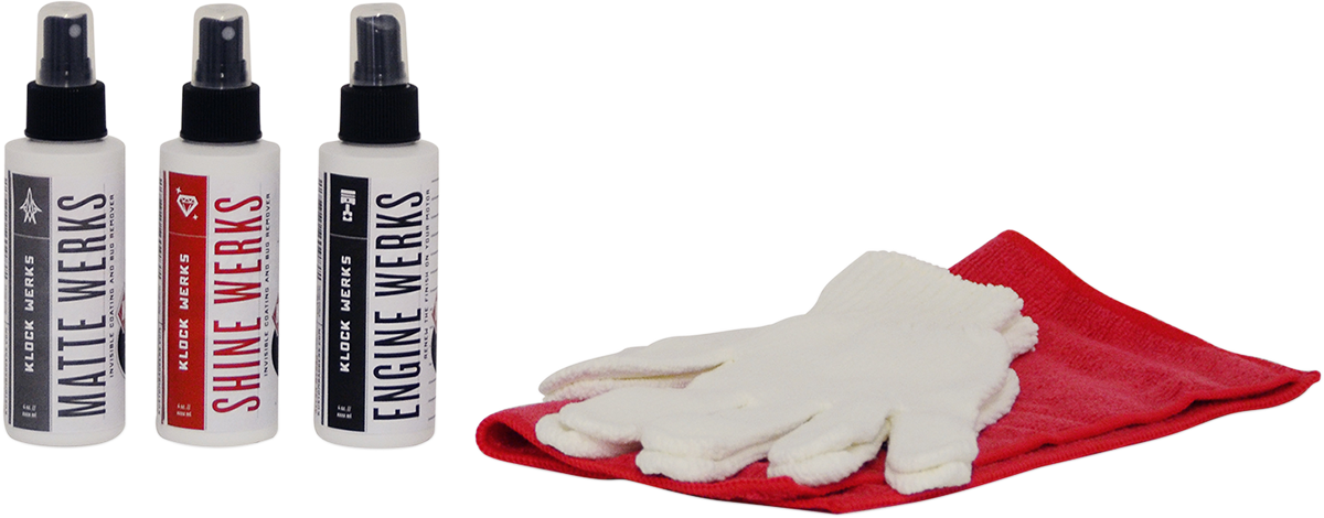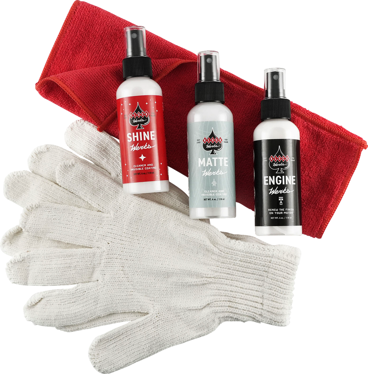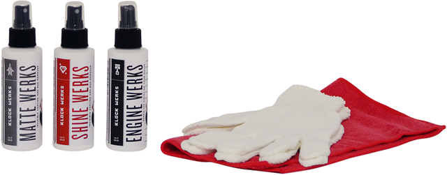 One 4 oz. bottle each of Shine Werks, Matte Werks, and Engine Werks along with Detail Werks microfiber polishing gloves, and a red microfiber towel all included in the Klean Werks Kit
