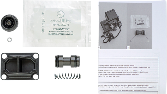 Kit includes piston with seals and spring, piston bellows, container bellows, sealing ring for piston mounting screw and silicone brake paste