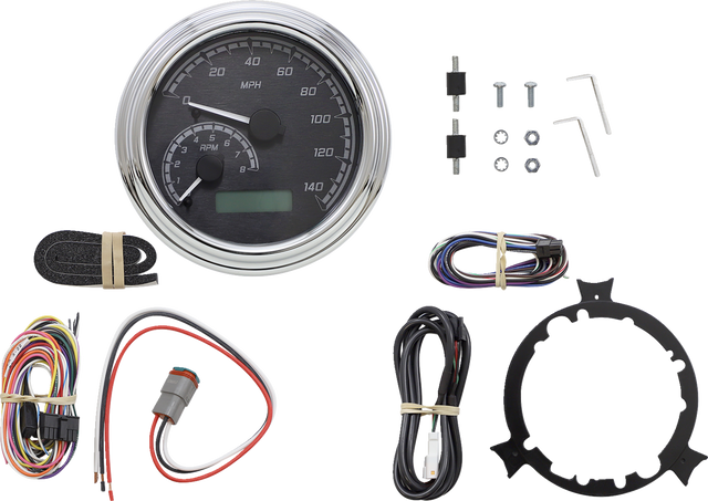 Has 140 mph speedometer, tachometer, odometer, dual resettable trip meters, and full indicator light complement (turn signal, high beam, neutral, low oil pressure) in one stylish gauge