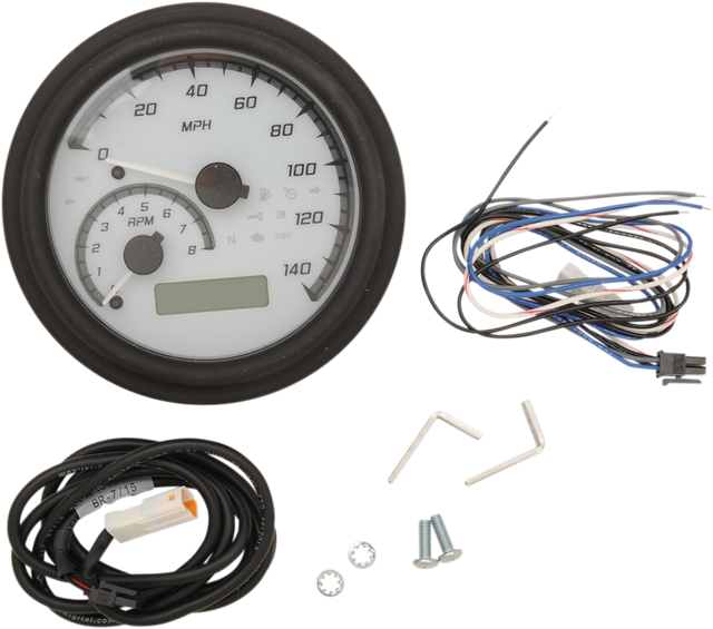 Has 140 mph speedometer, tachometer, odometer, dual resettable trip meters, and full indicator light complement (turn signal, high beam, neutral, low oil pressure) in one stylish gauge