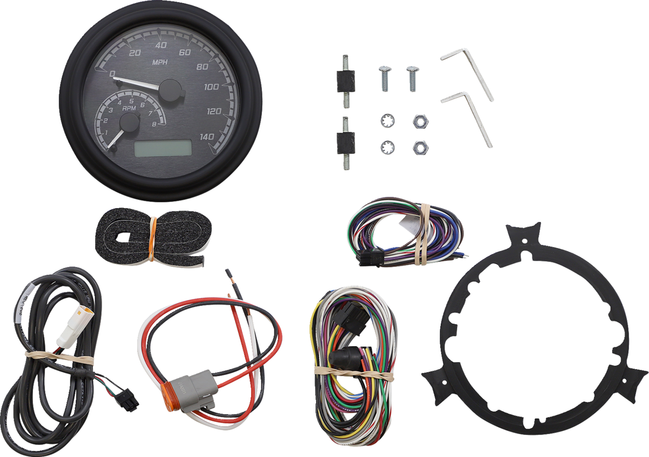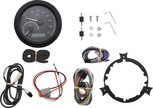 Has 140 mph speedometer, tachometer, odometer, dual resettable trip meters, and full indicator light complement (turn signal, high beam, neutral, low oil pressure) in one stylish gauge