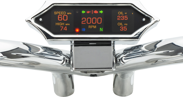 0-199 mph/km/h speedometer, 0-8,000 rpm bar graph tachometer, oil pressure gauge (sensor included), voltmeter, fuel level gauge (requires stock sender), gear position readout, clock, million-mile odometer with dual trip meters