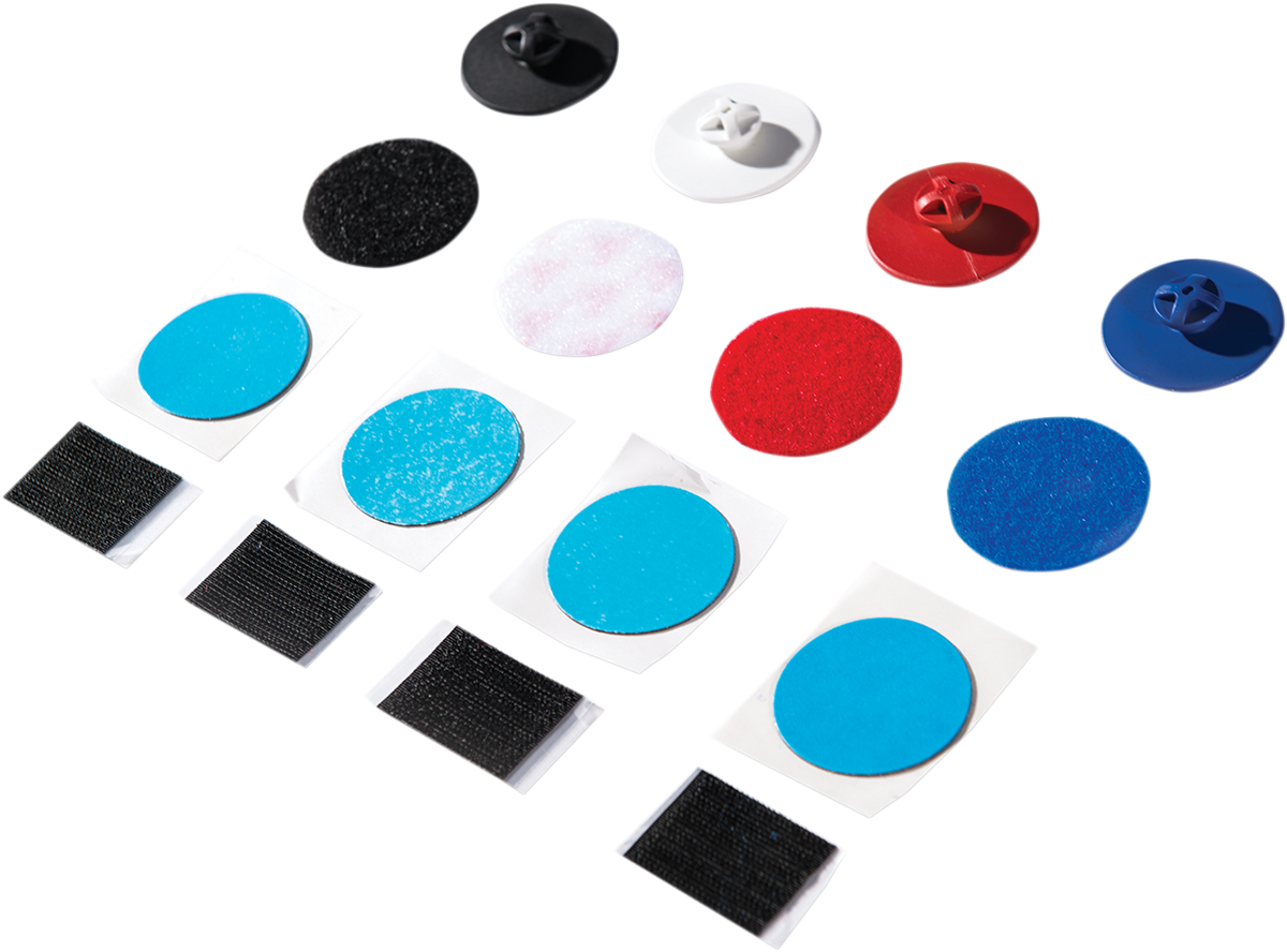 All the pieces you need to remount your complete Quick Strap System: hook-and-loop closure, plastic swivel button and adhesive