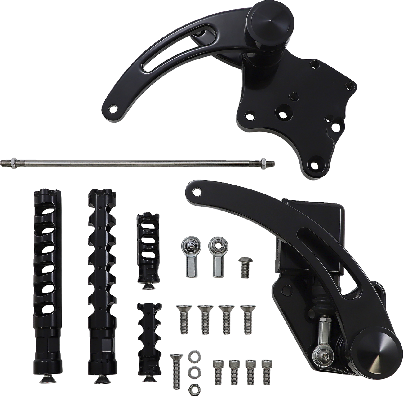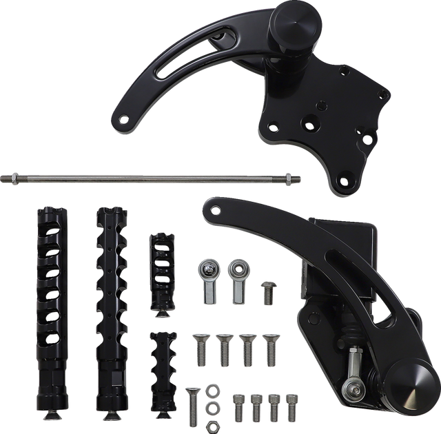 Includes chrome-plated billet master cylinder (unless noted), slotted shift, and brake arms with Muzzle brake foot and toe pegs along with shift linkage and mounting hardware