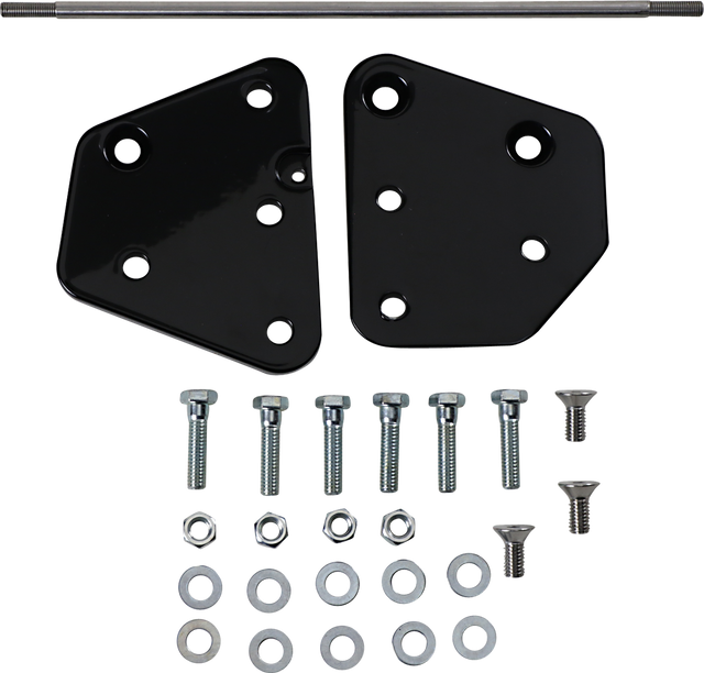 Kits include black powder-coated aluminum adapter plates, stainless steel extended shifter rod and mounting bolts