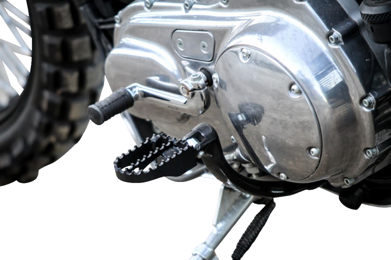 MX style steel pegs draw inspiration from the iconic bear trap style of 1970s motocross bikes