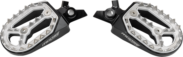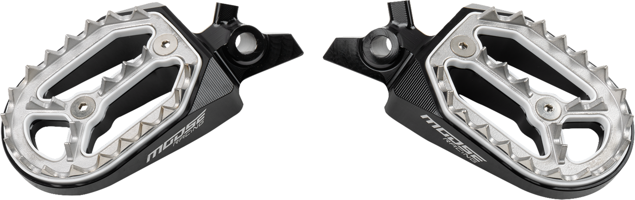 Extra wide replaceable stainless steel footplate providing the rider with ultimate grip