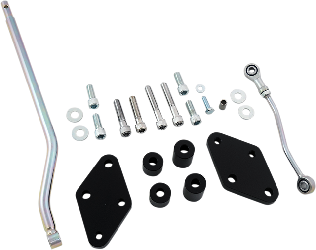 Kit includes mount plates, spacers, shift linkage rod, brake linkage rod, and mounting hardware