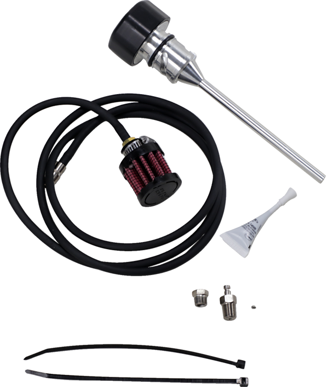 Includes 2 different venting style options for installing the dipstick: option 1 - 1/8 NPT breather vent fitting with internal porous filter element, option 2 - quick disconnect coupler fitting with rubber hose and filter element