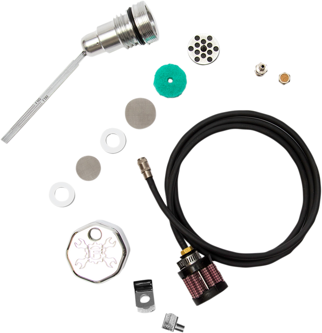 Includes 2 different venting style options for installing the dipstick: option 1 - 1/8 NPT breather vent fitting with internal porous filter element, option 2 - quick disconnect coupler fitting with rubber hose and filter element