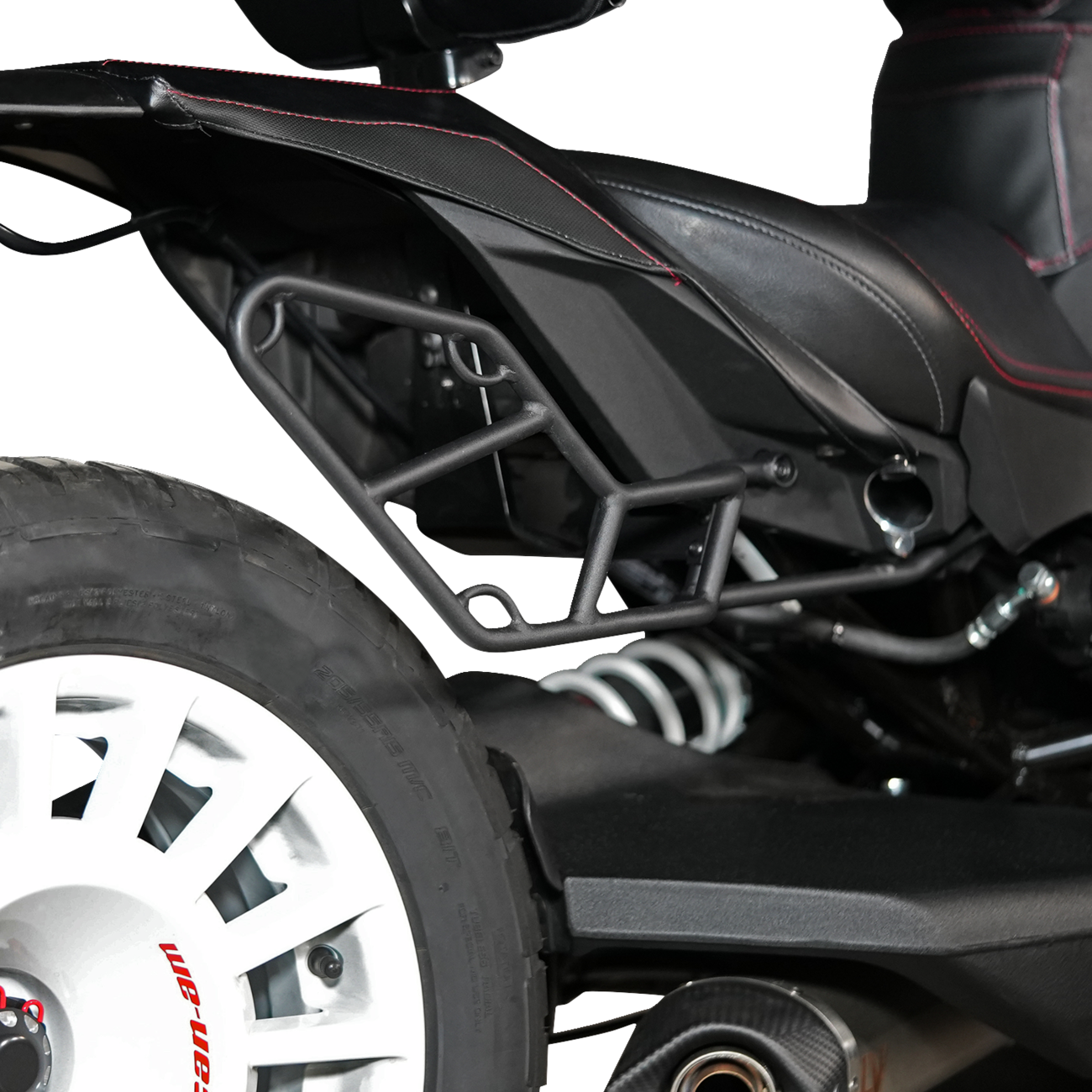 Powder-coated steel stay is compatible with passenger seats, OEM and Show Chrome passenger pegs, the Max Mount, and most aftermarket exhausts