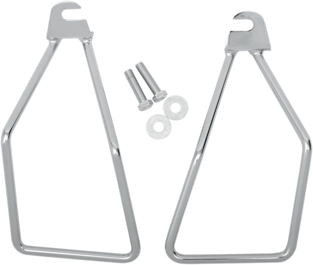 Chrome-plated steel brackets hold throw-over saddlebags away from brake caliper and swingarm