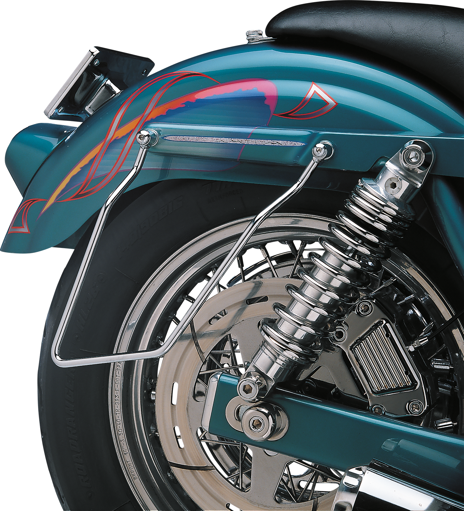 Chrome-plated steel brackets hold throw-over saddlebags away from brake caliper and swingarm
