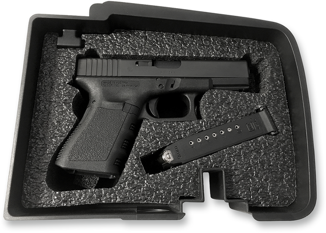 Die-cut perforated foam designed to fit at least nine different configurations of Glock® (G17, G19, G21, G22, G25, G31, G32, G37, G38) and 9mm, 10mm, .40, .45, .380 and .357 clips