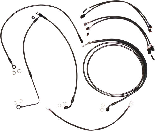 Kit includes throttle and idle cables of throttle-by-wire extensions, clutch cable or hydraulic clutch line, brake lines, copper crush washers, hardware, and any necessary switch wiring of turn signal extension