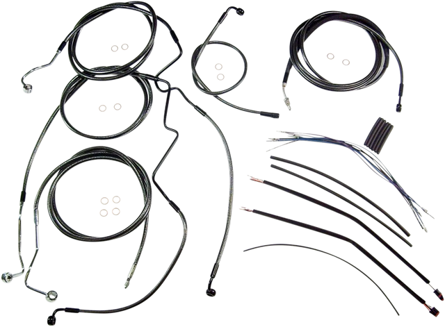 Kit includes throttle and idle cables of throttle-by-wire extensions, clutch cable or hydraulic clutch line, brake lines, copper crush washers, hardware, and any necessary switch wiring of turn signal extension