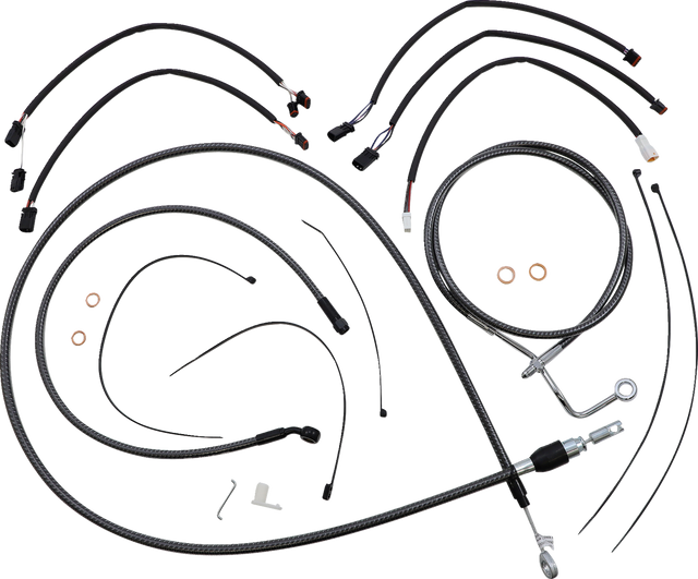 Kit includes – Premium brake lines, clutch cable or hydraulic clutch line, throttle and idle cables or throttle-by-wire extensions, hardware, and fully terminated or plug-and-play switch and turn signal extensions