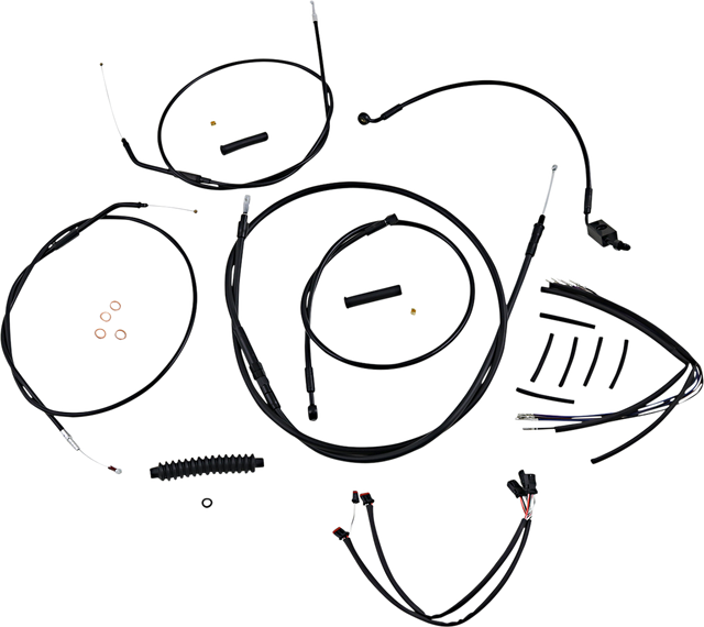 Kit includes throttle and idle cables or throttle-by-wire extensions, clutch cable or XR hydraulic clutch line, XR brake lines, copper crush washers, hardware, turn signal and switch wiring extensions