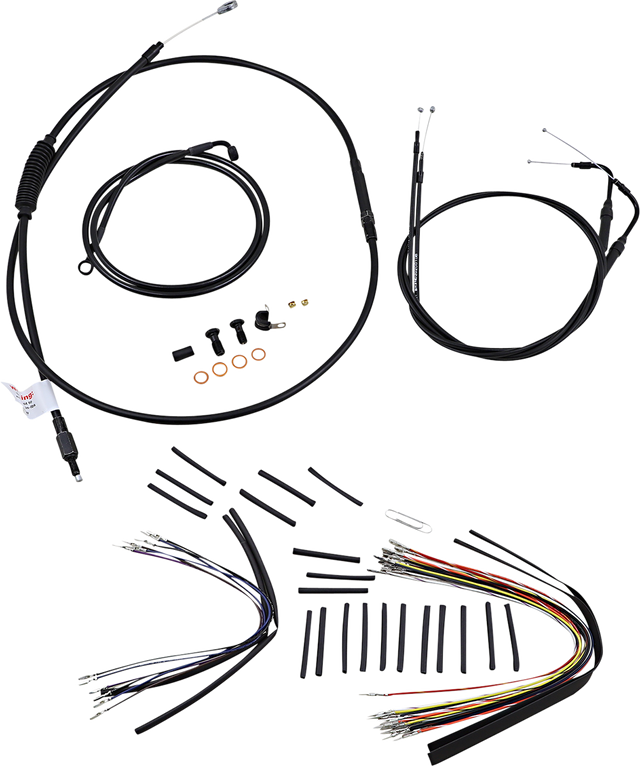 Kit includes extended brake line (unless noted), extended clutch cable/clutch line, extended throttle/idle cables as required and all necessary wiring