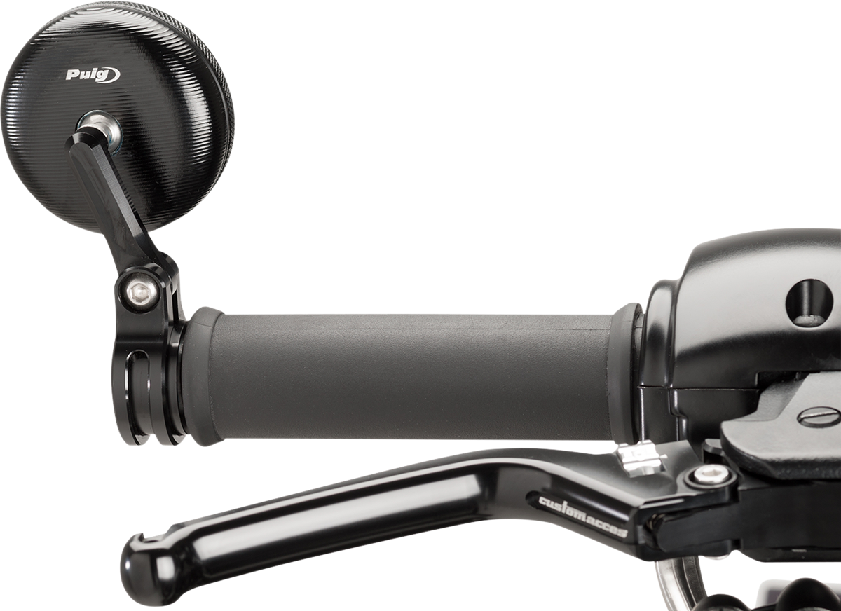 It is adjustable, both in tilt and height, and easily fits onto the handlebar end of the motorcycle in a vertical position