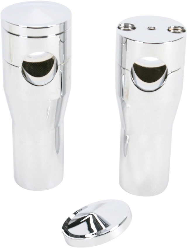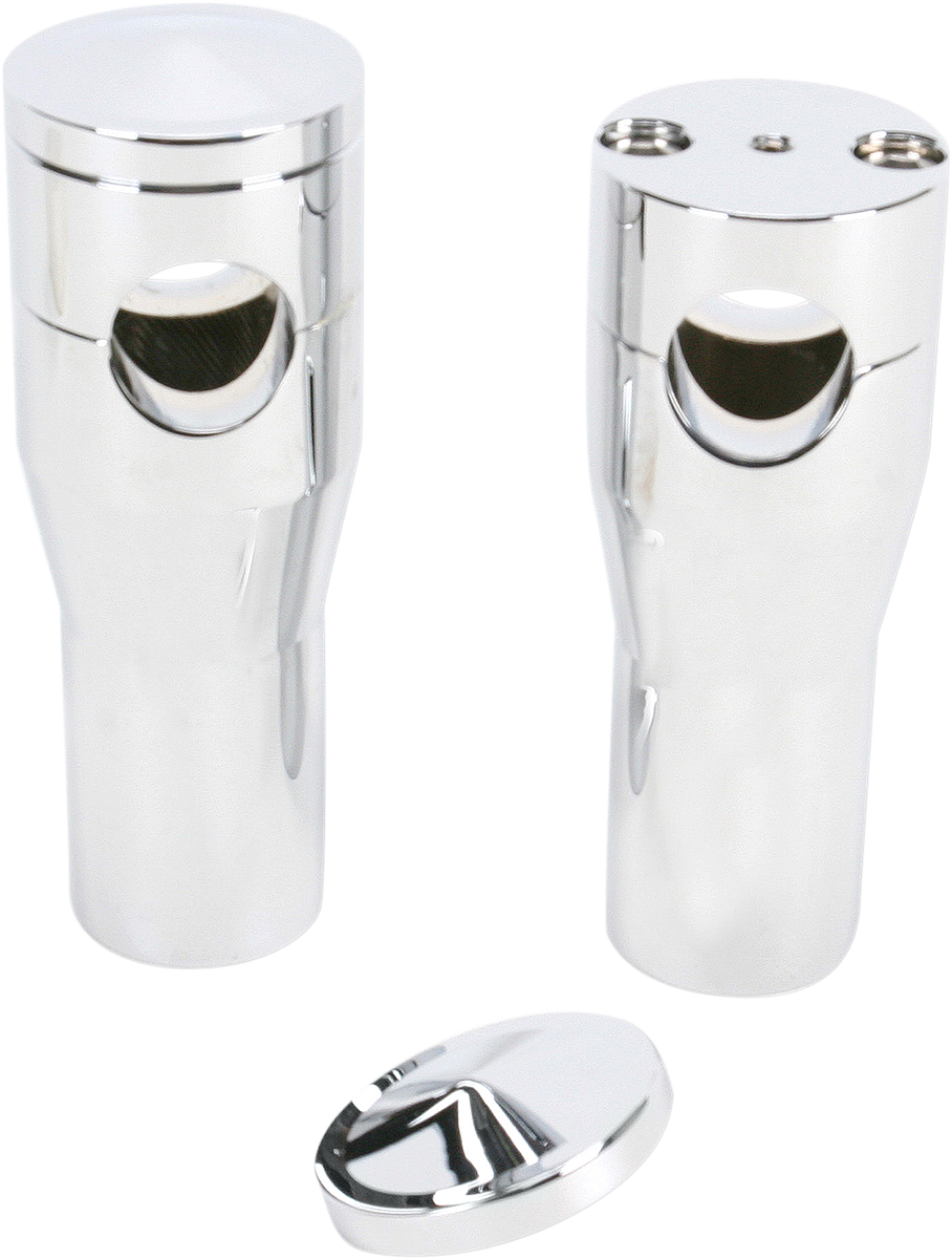 Chrome billet aluminum risers feature the unique concept of a removable cover that hides the upper handlebar clamp bolts