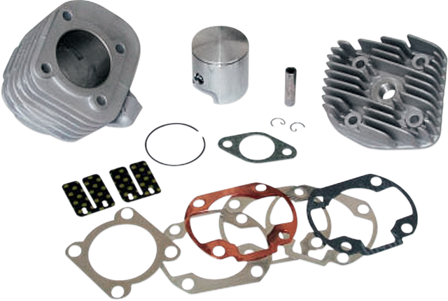 Kit includes complete aluminum cylinder, with a nickel carbide plated bore, cylinder head, piston, rings, 10 mm wrist pin, circlips, carbon reeds and all required top-end gaskets