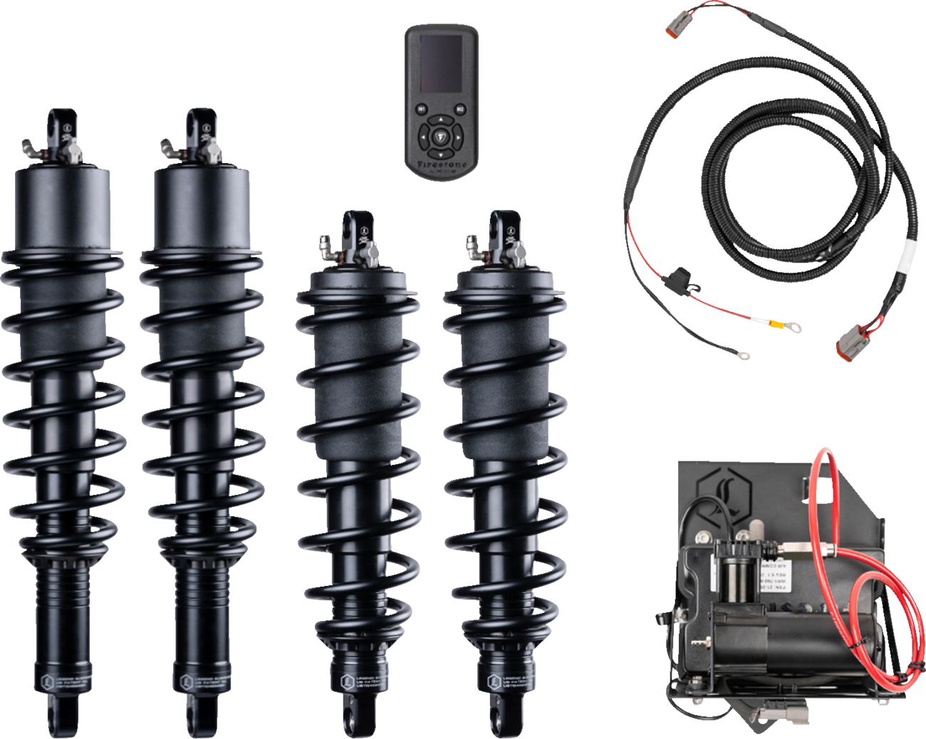 Kit includes four shock assemblies, pre-mounted compressor assembly, remote control, wire harness, airline, and air fittings for easy installation