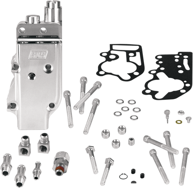 Kit includes oil pump, universal cover with top and bottom feeds, mounting bolts, supply and return gears, drive shaft with keys and snap rings, check ball and spring, pressure relief valve and spring, check ball and release valve cover screws with O-rings, miscellaneous hose fittings, plugs, screws and gaskets
