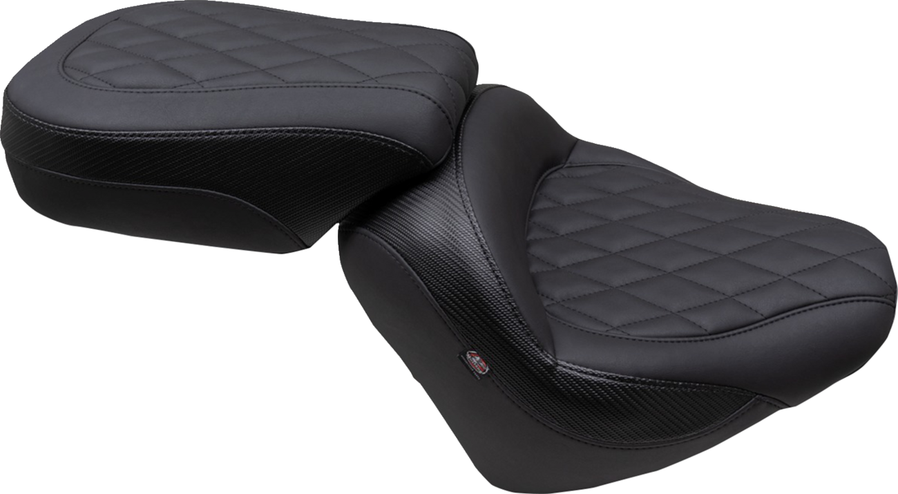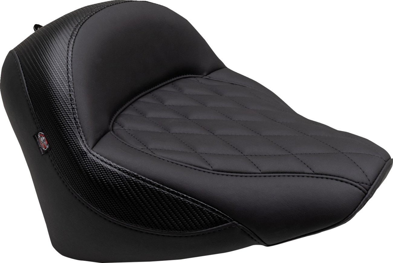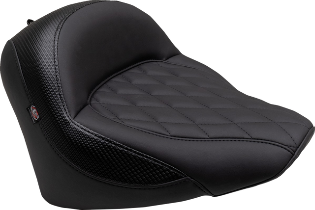 Wide bucketed rider area provides excellent support with a classic diamond stitch and carbon-fiber look accents