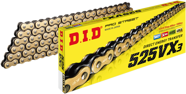 The 525 VX3 chain has an 8% tensile strength increase due to the hardness of its inner plate