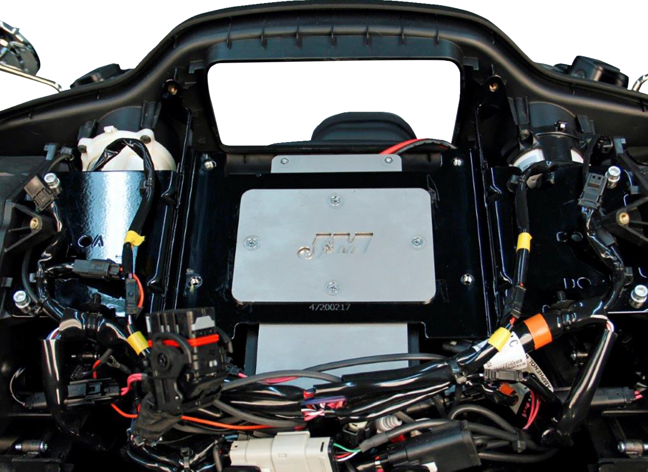 Amplifier mounts to the Lazer-cut stainless steel 2-piece bracket system, to provide solid and secure mounting inside the fairing