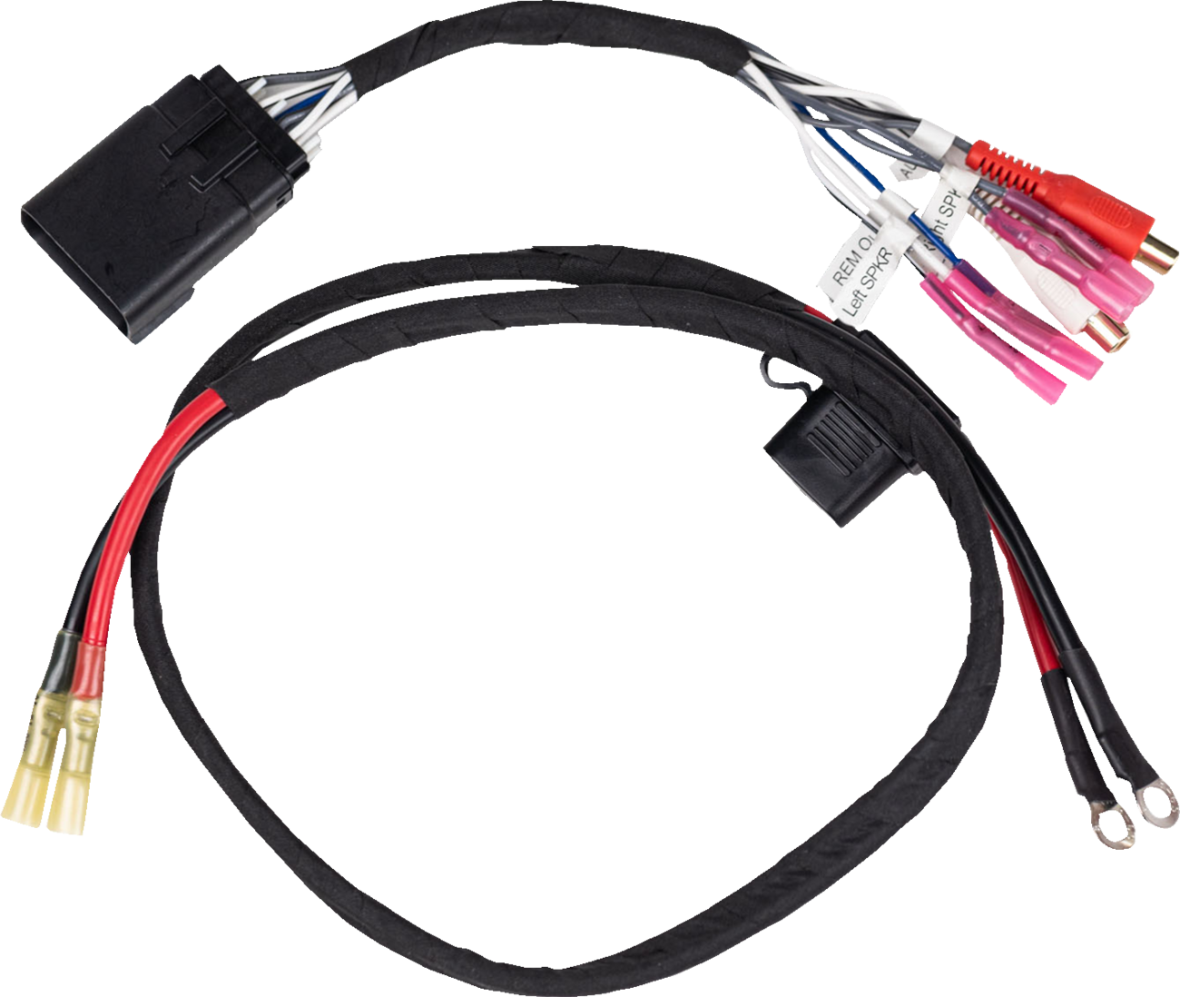 Adapts the OEM Ride Command amplifier plug from the OEM harness to integrate with an aftermarket amplifier