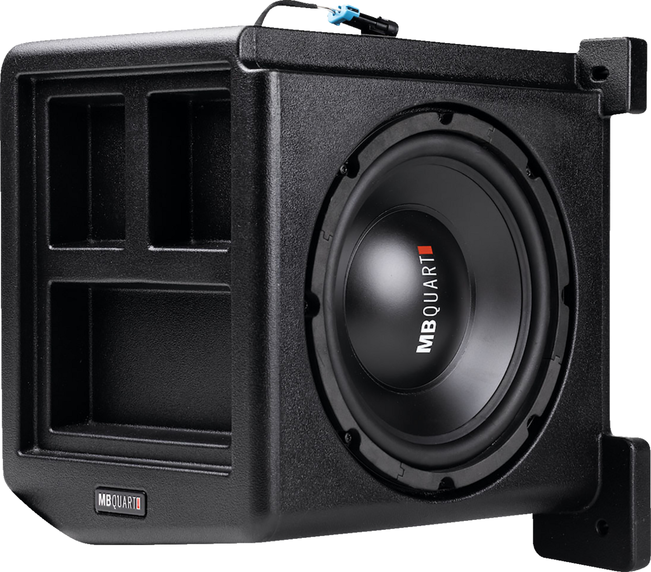 Dual voice coil 10\" subwoofer in a high impact HDPE composite enclosure fits under the front passenger seat