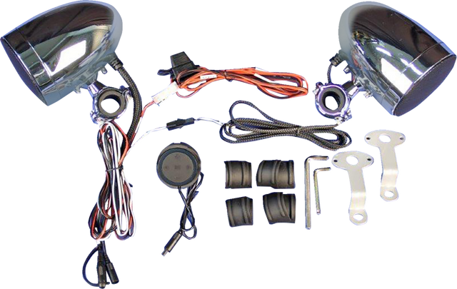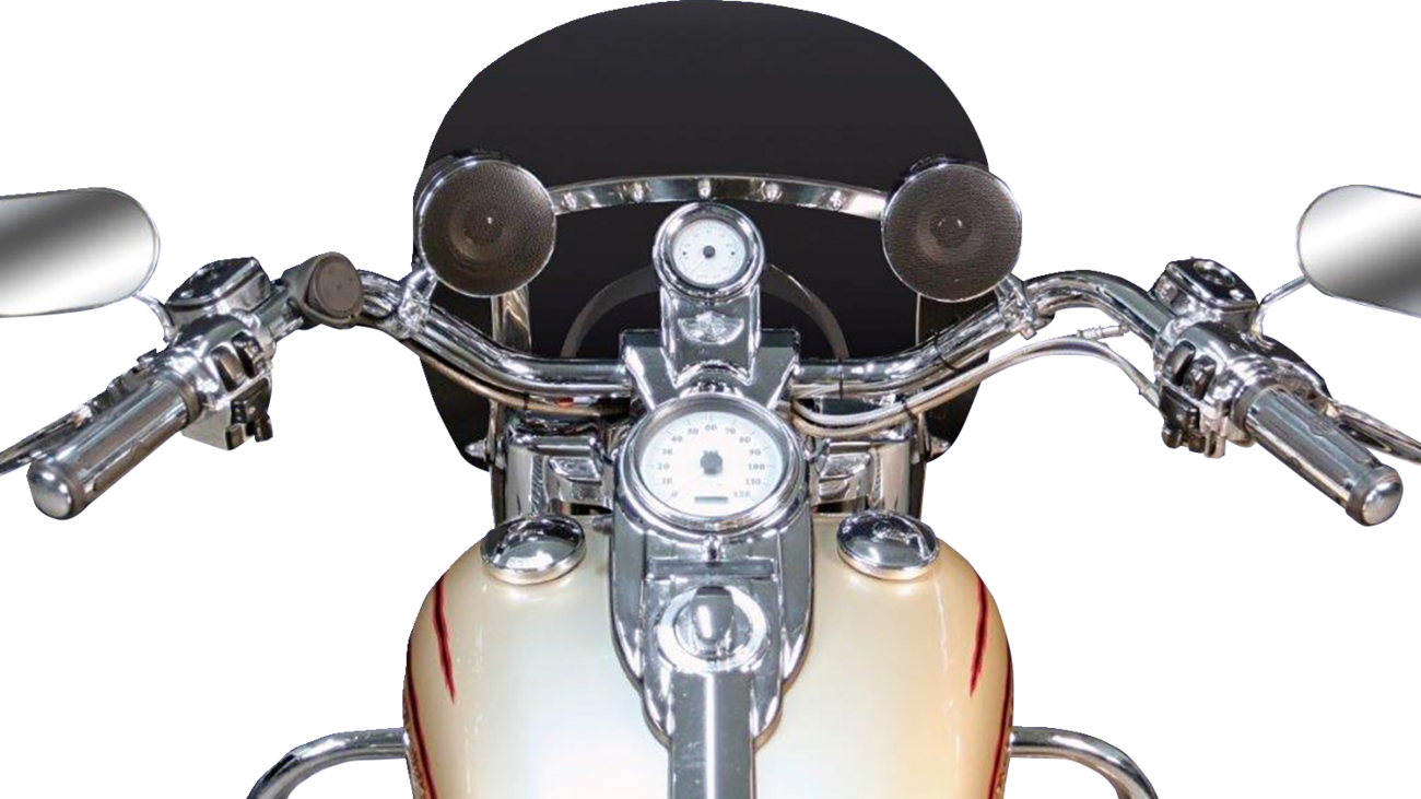 Flexible mounting options include handlebar clamps with bushings to fit 7/8”, 1” and 1-1/4” diameter handlebars, along with mirror mounting bracket plates