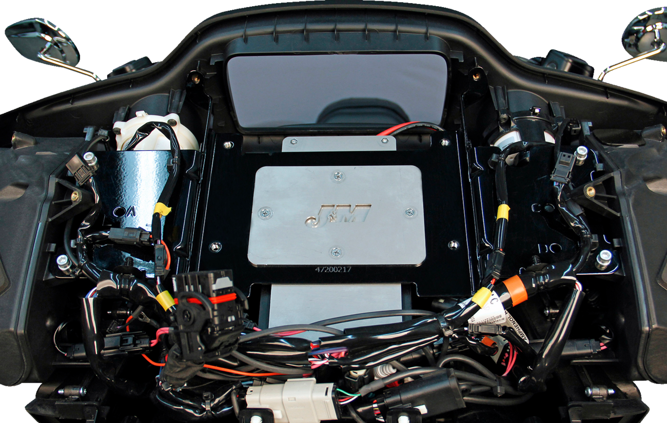 Amplifier mounts to the Lazer-cut stainless steel 2-piece bracket system, to provide solid and secure mounting inside the fairing