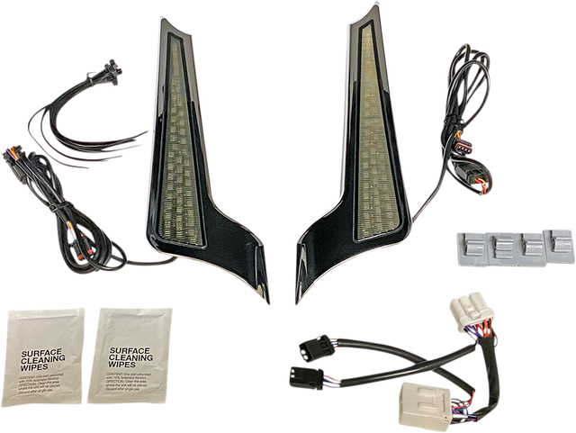 Units adhere to each side of the rear fender fascia with double sided tape and include a plug and play wire harness for a simple install