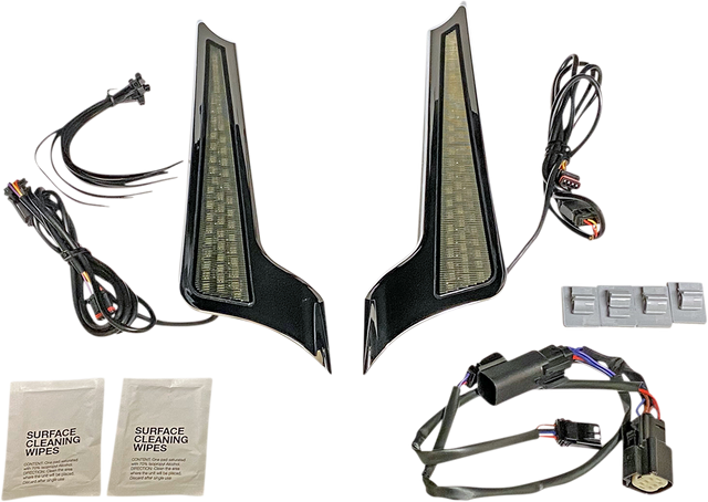 Units adhere to each side of the rear fender fascia with double sided tape and include a plug and play wire harness for a simple install