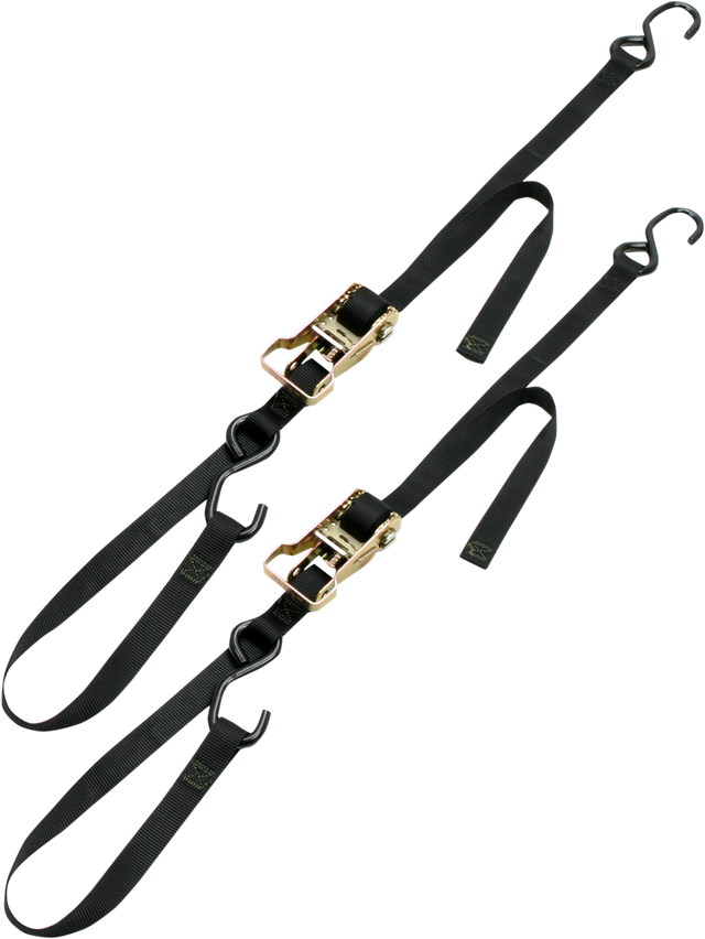 Twin pack of ratchet-buckle tie-downs with soft-hook tie-down straps for securing motorcycles, snowmobiles, ATVs and other equipment