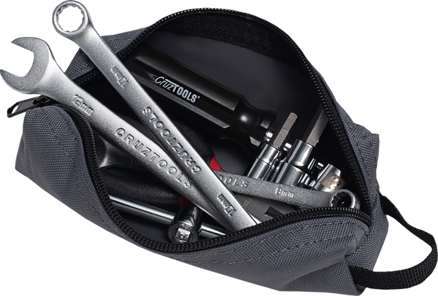 Includes full-size combination wrenches, collapsible T-handle driver, sockets, torx & hex bits, 5-in-1 screwdriver, needle nose pliers, mechanics wire and a durable zip up pouch
